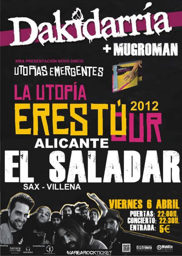 Entre Sax i Villena en el Club Saladar, amb una banda amb gran projecció estatal. Dakidarría, un grup galec que, per a la parada alacantina en la seua gira espanyola ″La Utopía eres tu(our)″, ens ha convidat a arrancar la nit. El preu de l′entrada és de cinc euros.